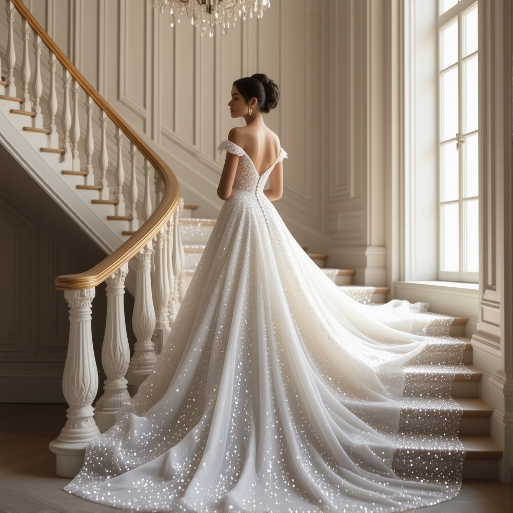 Shimmering Off-Shoulder Gown, Glittering Sequins Wedding Dress for Brides, Modern Statement Design